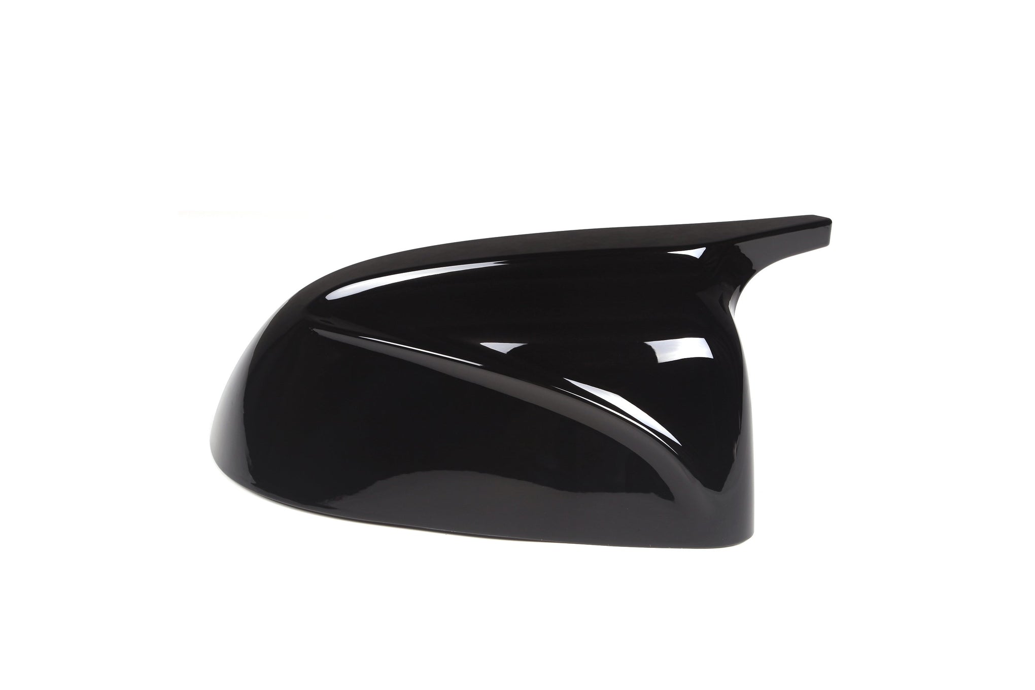Two glossy black car side mirror covers are positioned symmetrically, facing each other on a plain white background. Their sleek, aerodynamic design reflects light.